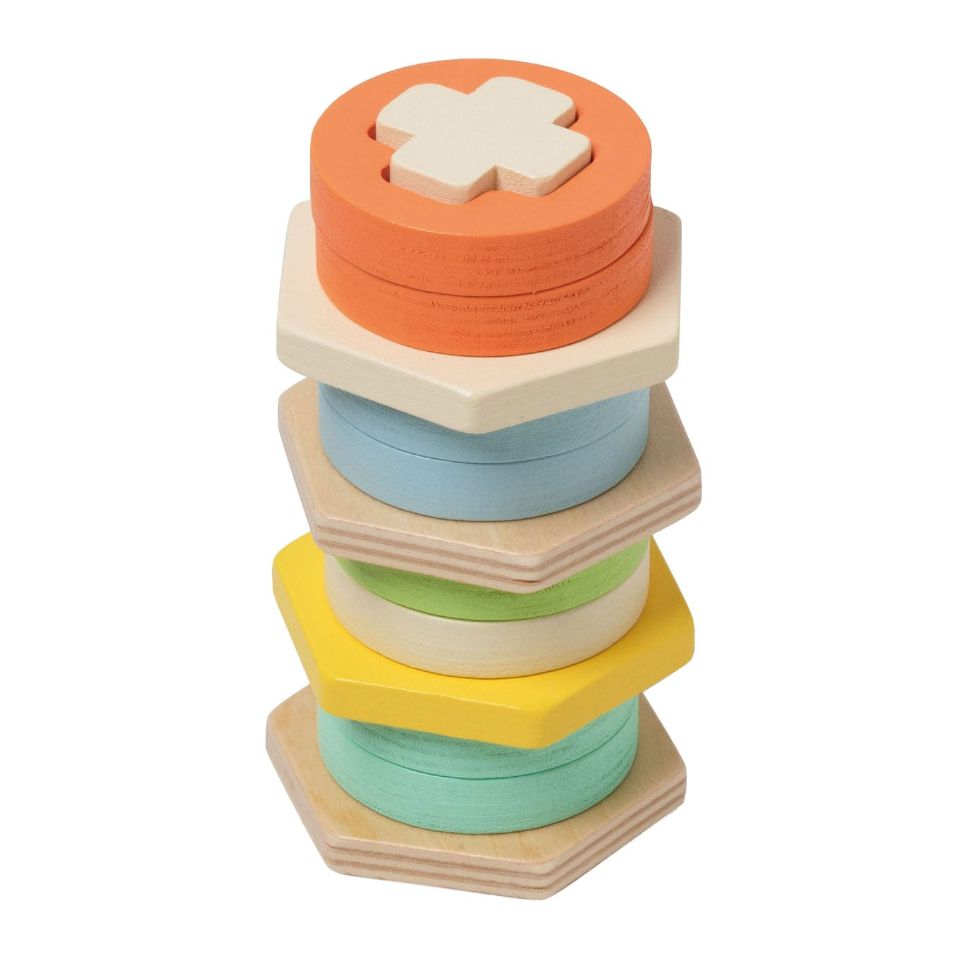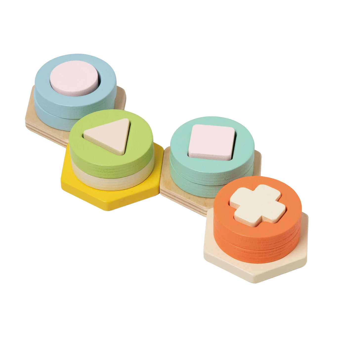 Leren, ontdekken en stapelen! Met dit vormen matchen spel oefenen jonge kinderen spelenderwijs het herkennen van vormen en kleuren. De vier pilaren hebben ieder een eigen vorm, waardoor de houten blokken alleen op de juiste plek passen. Zo ontstaat er een leuke uitdaging die de hand-oogcoördinatie en fijne motoriek stimuleert.